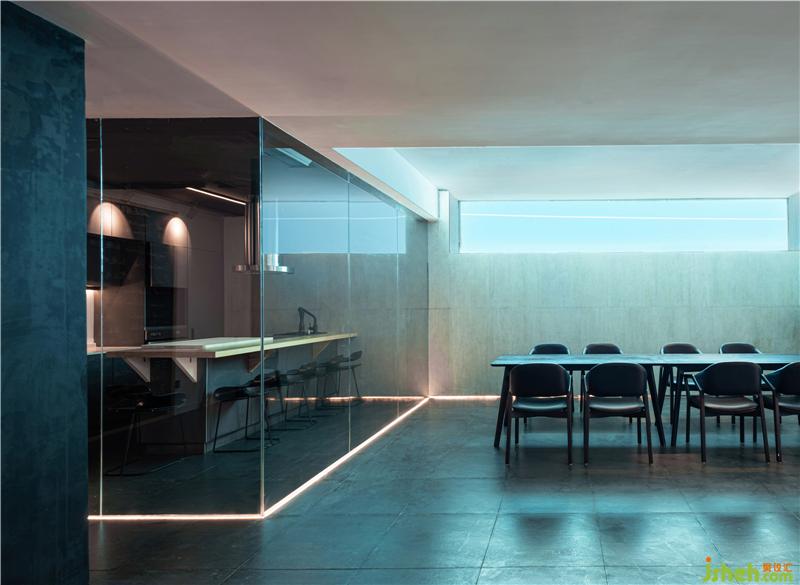 地下室擁有餐廳、會(huì)議區(qū)、廚房以及烘焙區(qū),在墻體開出一個(gè)長(zhǎng)條形窗扣,光線透過(guò)水的折射撒入室內(nèi),讓空間變得更加明亮,開闊。