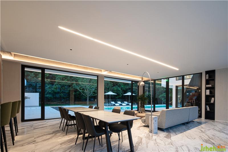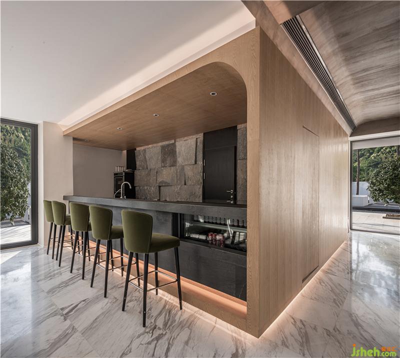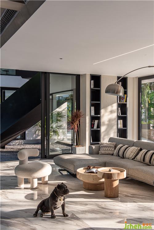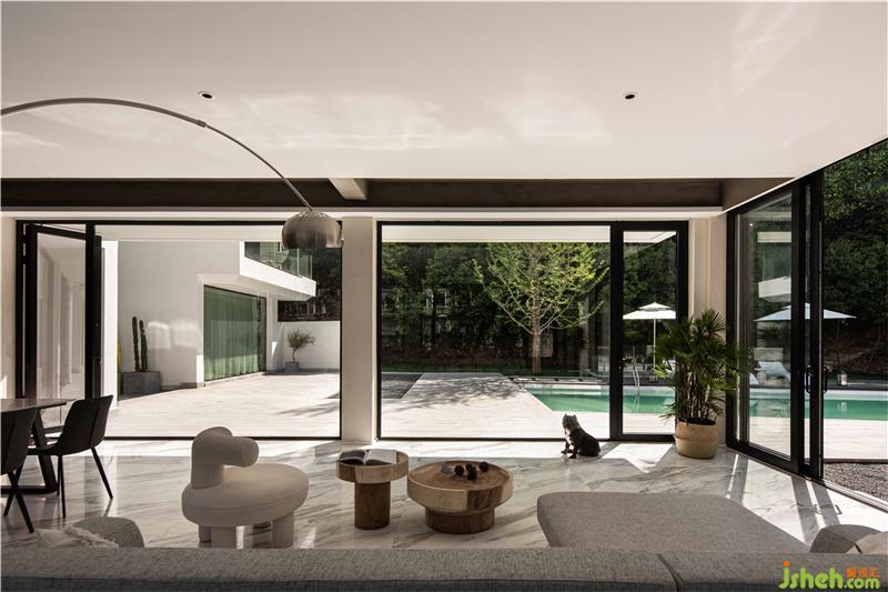 步入室內(nèi),一層客廳采用全敞開(kāi)式設(shè)計(jì),270°落地窗,能夠讓杉林景觀映入室內(nèi),住客能夠自由穿梭在其中。