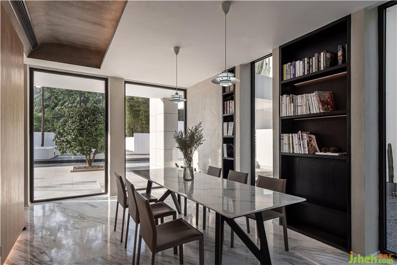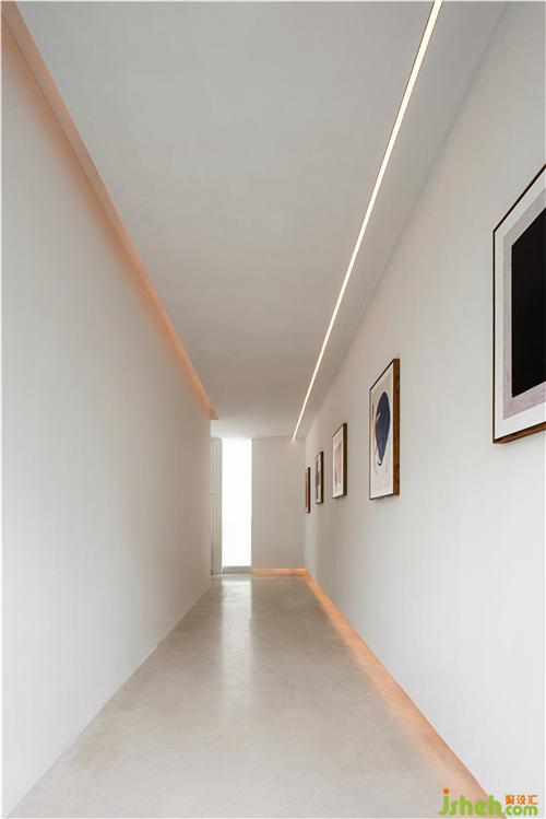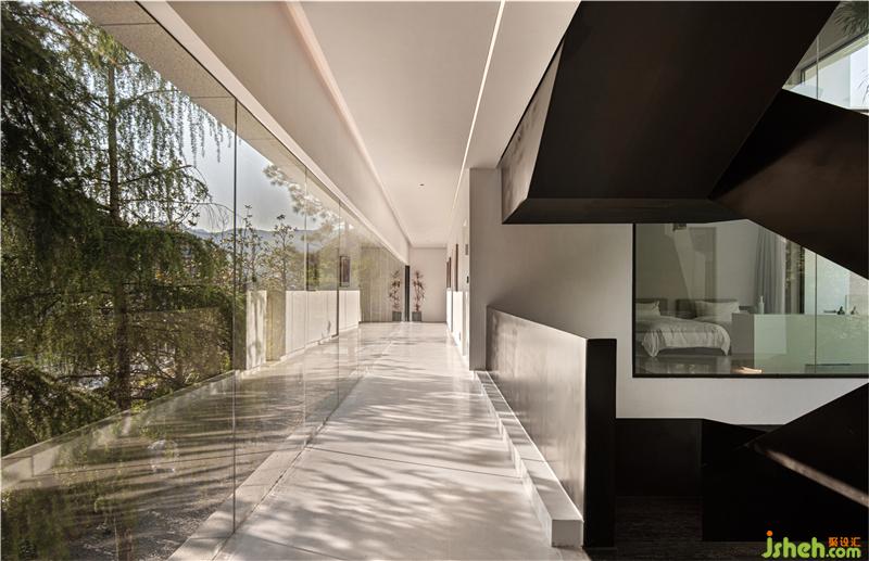 由于地理環(huán)境限制,一面是山一面是馬路,為了減少周邊環(huán)境的干擾,設(shè)計(jì)師因地制宜,改變了原本入口位置,將靠馬路一側(cè)改為過(guò)道,開(kāi)出了一條長(zhǎng)長(zhǎng)的藝術(shù)走廊,在能欣賞到周?chē)坝^的同時(shí)也能保持獨(dú)立性。
