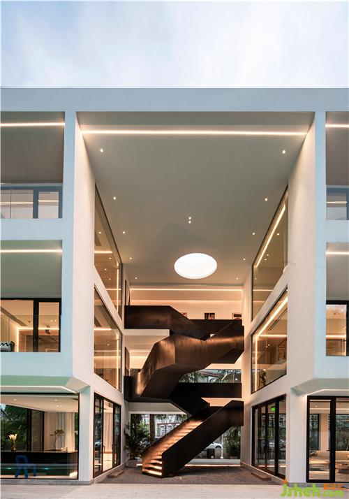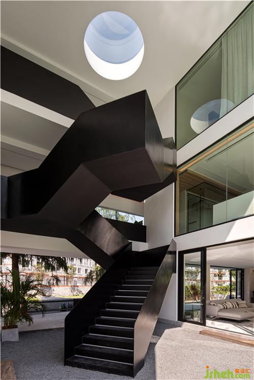 充滿力量感的樓梯將建筑相連,頂部的圓形天窗讓光線照亮整個(gè)樓梯,抬頭便可以延伸出天空中,增加了空間感與互動(dòng)性。