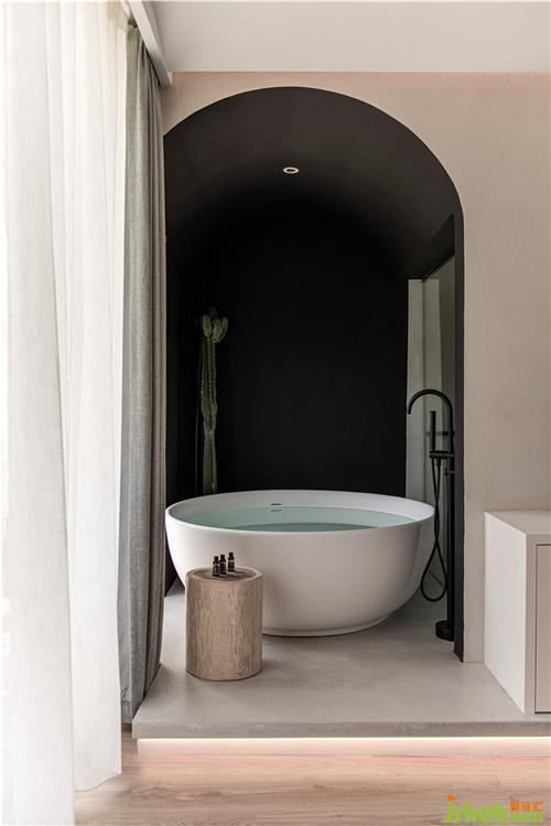 拱圓造型的門框內(nèi)放置浴缸,像是一個儀式感,住客能在此享受安靜不被打擾的私人空間。