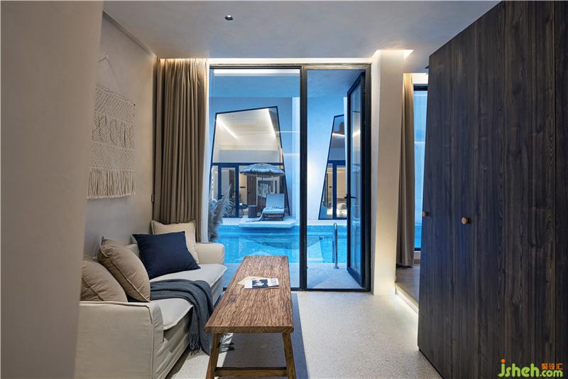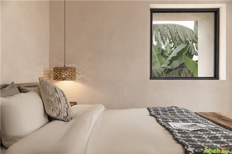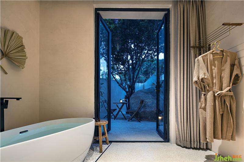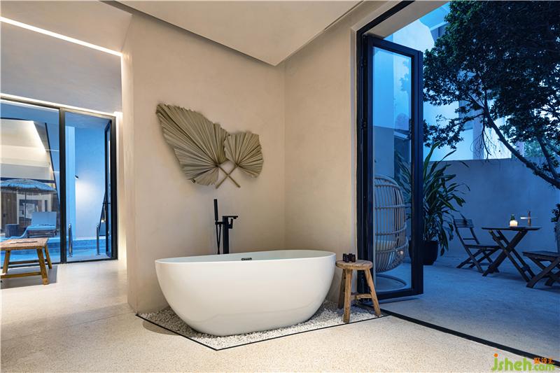另一間套房與泳池相連,也有一個(gè)獨(dú)立的院落,原生的天然石頭與樹木在空間中形成新的碰撞,在這里可以享受片刻寧靜。