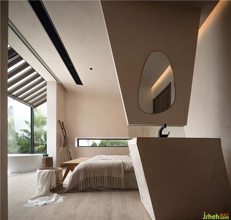 二層的客房配有獨(dú)立的陽臺(tái),穿透海底的光線為設(shè)計(jì)靈感,分別使用圓形與長條形的造型般作為屋檐,最大程度地讓陽光灑滿空間的每一個(gè)角落。