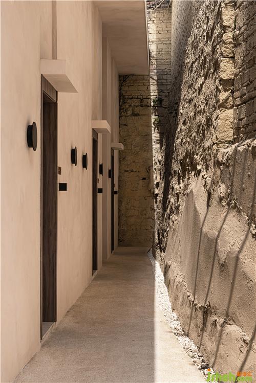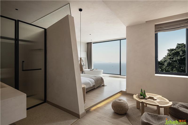 Walking up to the rooms on the third floor, you can see the sea view not far away. The background wall tilts into the space like the inspiration of abstract waves, which is full of movement.