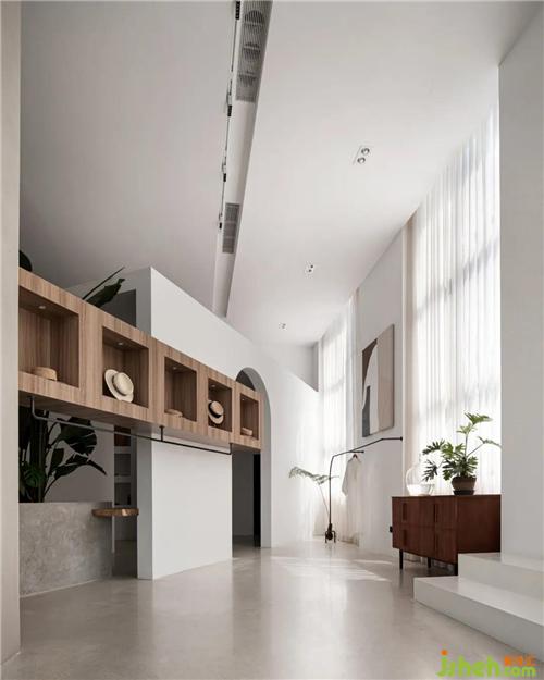設計師在空間中鋪設層層臺階,不僅提升了造型感同時也能作為展示和休息的功能杭州店鋪設計。