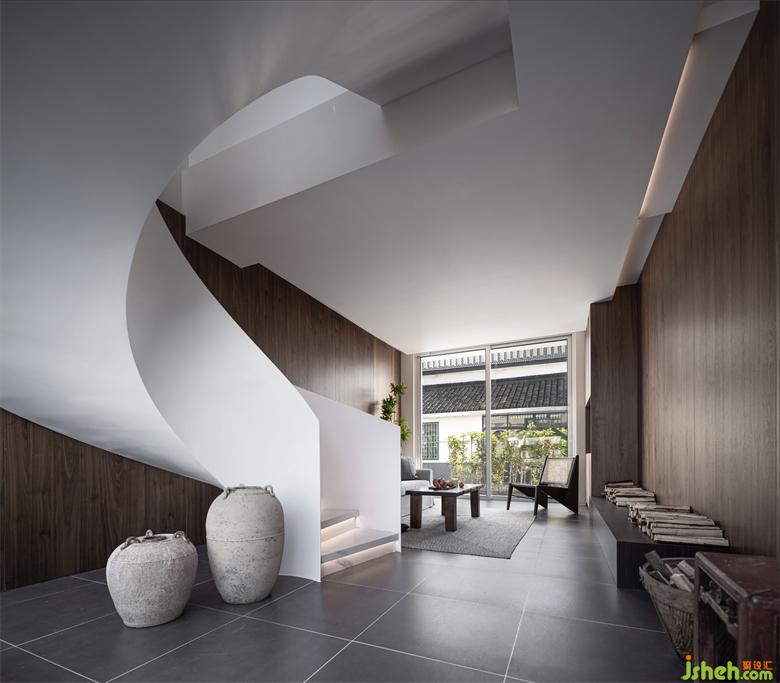 In order to unify the architectural style of the village with white walls and black tiles, the designer added a grille to the facade of the building to wrap the original building, which can protect the privacy of the internal space while being beautiful.