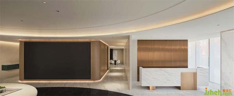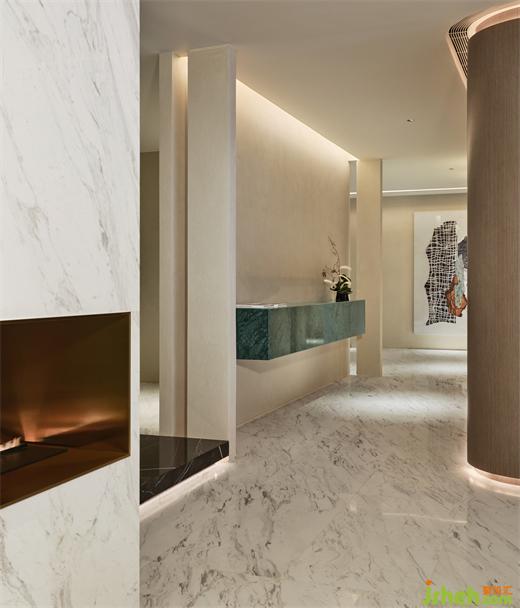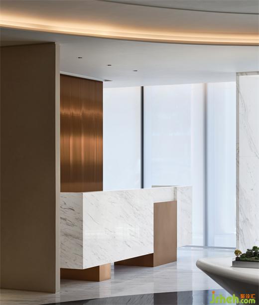 With metal material selected as the background of the whole wall, the sense of lustre increases the visual experience like sparkling sea surface for the space. Meanwhile, the collision of metal and marble in material and color brings great tension to the space.