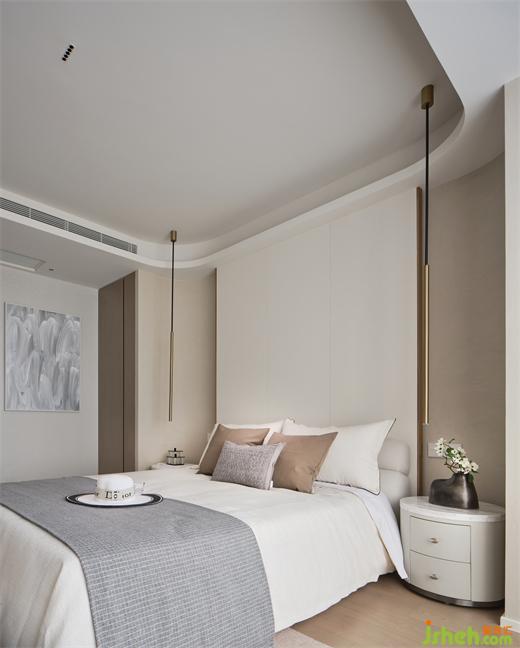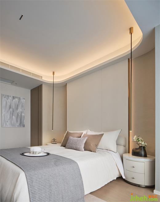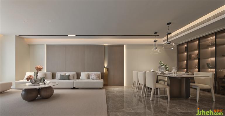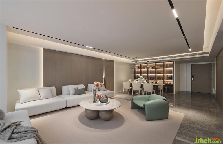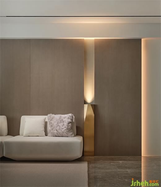 I戶型溫柔雅致,以素色為基調,嵌入背景墻內的異形雕塑,整個空間奠定了藝術感的生活基調。