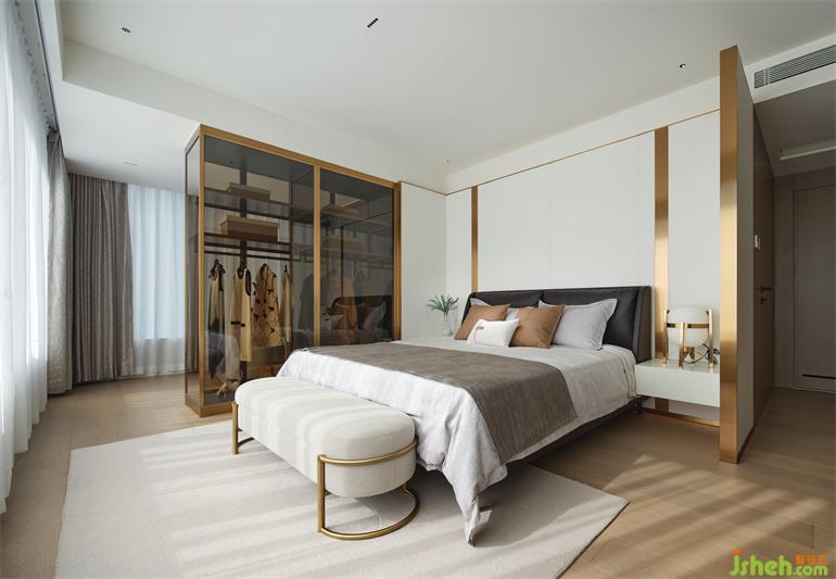豪宅設計主臥室內設計了開放式衣帽間,空間盡量敞開,活動自由。金屬的線性材料讓空間充滿典雅與奢華感。