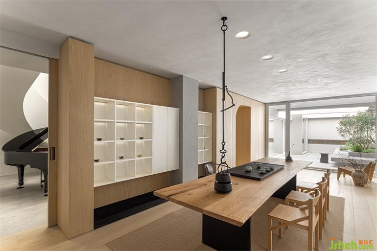 茶的禪意與哲學(xué)反映出主人的喜好與生活方式,臺州別墅設(shè)計(jì)師在茶室中保持著極簡與功能性,以木色體現(xiàn)空間氛圍,讓品茶融入生活,更是與自然產(chǎn)生對話。