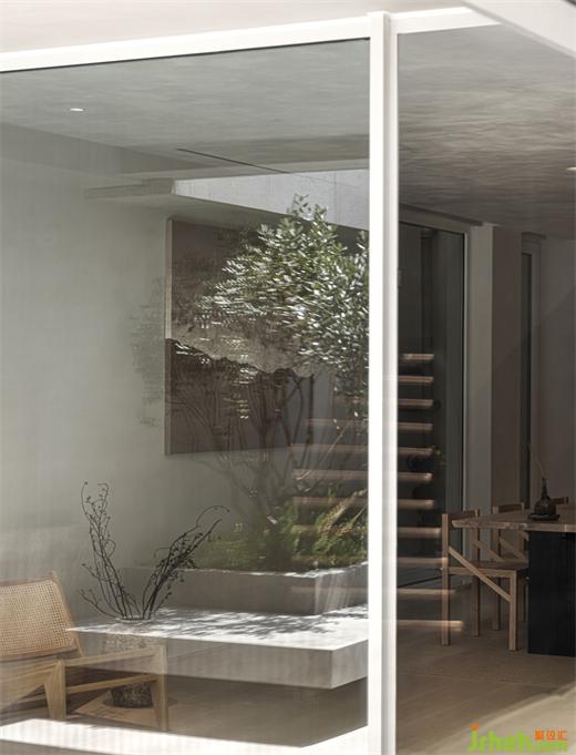 The sculptural spiral staircase runs through the entire residence, carrying the growth of space like a tree trunk. When light enters the interior, the visual experience is elongated vertically, breaking the dull pattern, so it is more free and full of power.