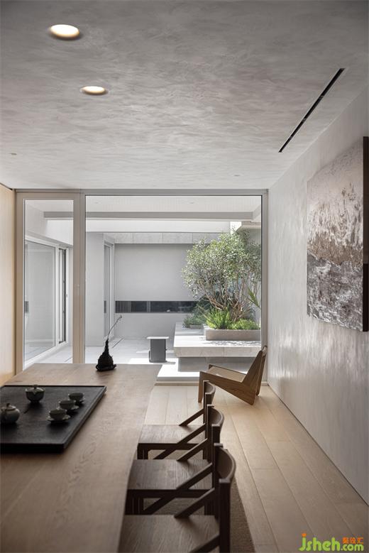 臺(tái)州別墅設(shè)計(jì)在空間的布局上,餐廳、客廳等活動(dòng)區(qū)圍繞著下沉式庭院分布,達(dá)到一處一景的空間感受。花園景觀透過(guò)落地玻璃映入室內(nèi),室外的自然環(huán)境與室內(nèi)產(chǎn)生互動(dòng),進(jìn)一步喚醒了人們對(duì)自然的美好向往。