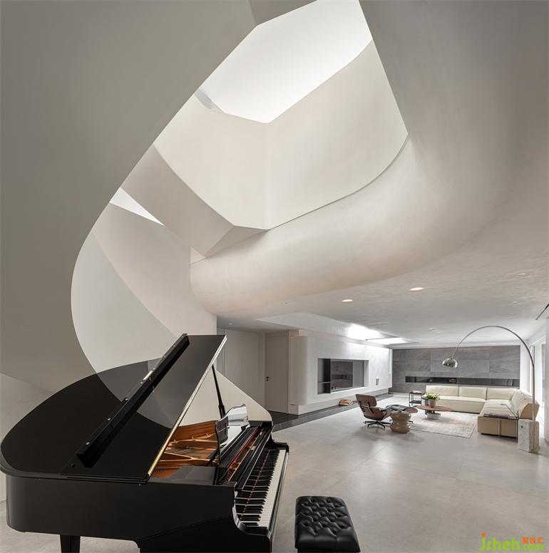 建筑讓空間承載了更多的包容性,頂部的拱形造型頂使空間變得更加開(kāi)闊富有層次感,臺(tái)州別墅設(shè)計(jì)弧形的電視機(jī)墻結(jié)合壁爐讓一切看起來(lái)如此地舒適與和諧。