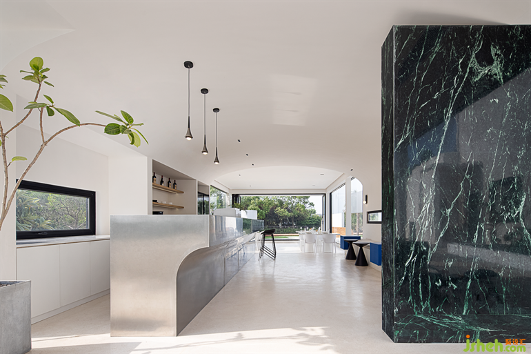 Large floor-to-ceiling glass plays a role in connecting the interior and exterior in the building, allowing the outdoor scenery to reflect the space, and further integrating the space with nature.