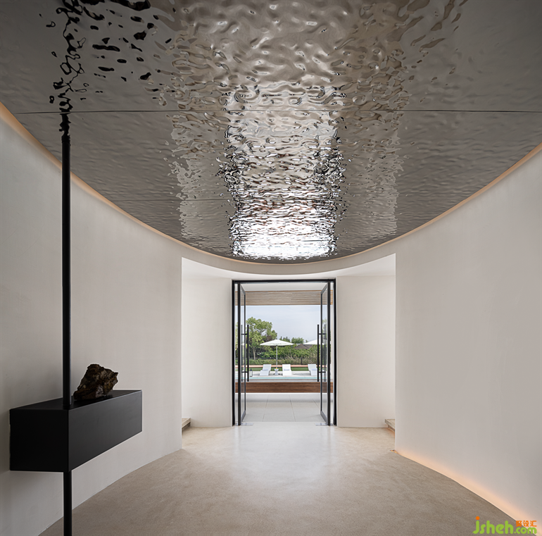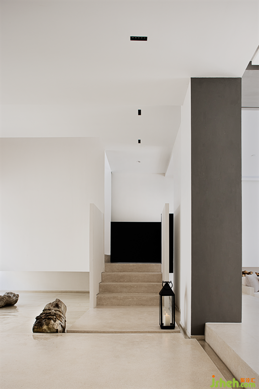 The sculptural stairway further enhances the artistry of the space, placing taihu Stone and lake water into the space to form a miniature landscape, as if in the beautiful scenery.