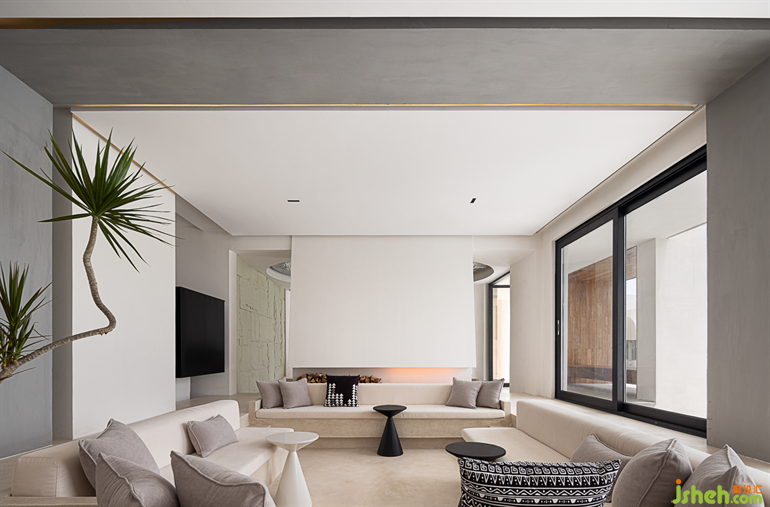 The sunken booth in the living room is combined with the fireplace to feel the minimalist beauty of the space in a proportionally balanced construction. The staircase leading to the second floor is expanded into a square black volume, which is quite poetic to stand on the deck and overlook the island scenery.