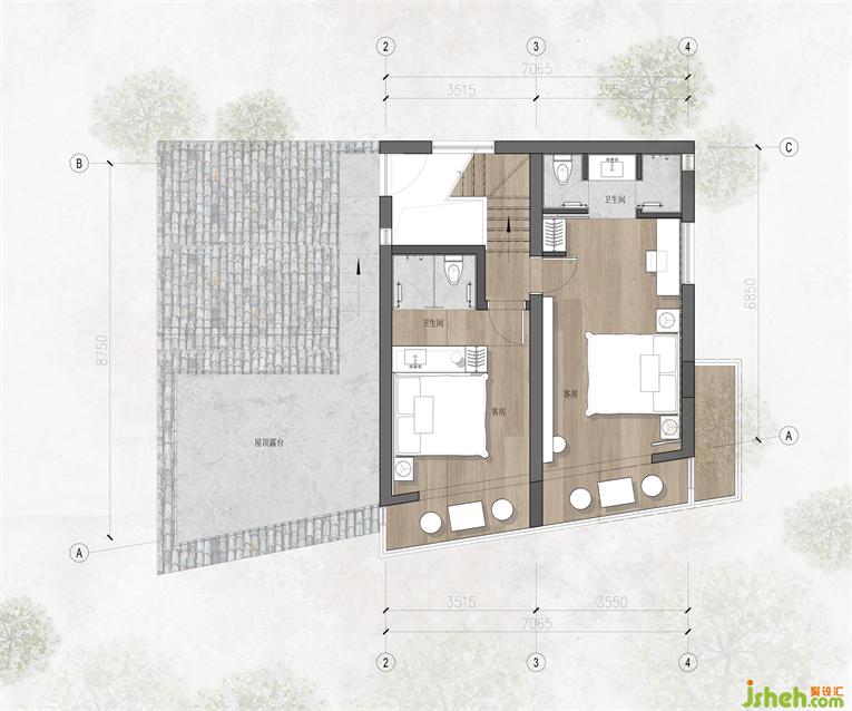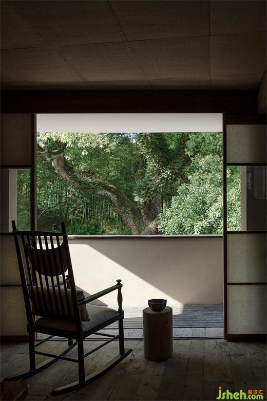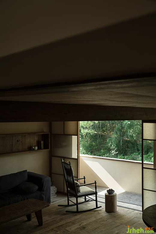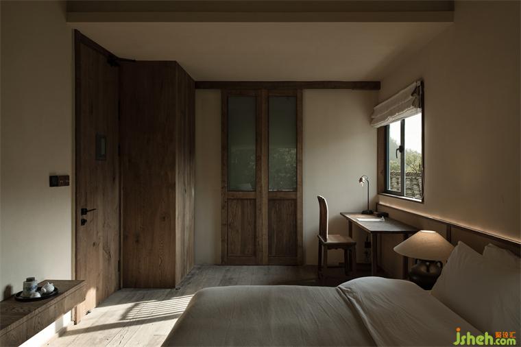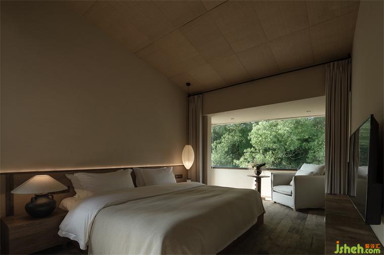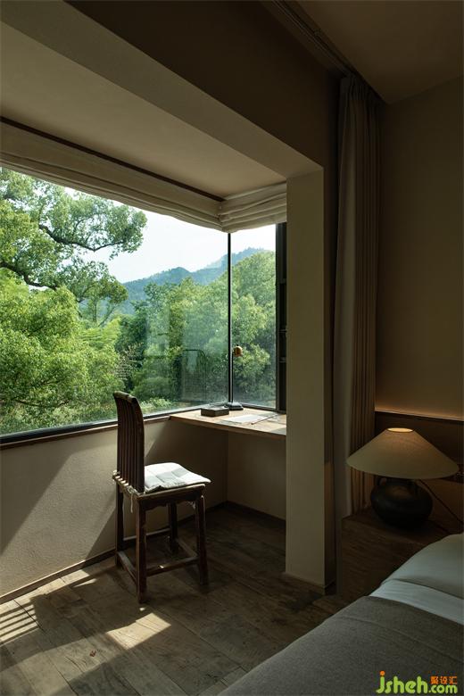 推開(kāi)客房的門(mén),不刻意對(duì)空間進(jìn)行修飾,讓窗外的景象成為空間中的一部分,綠意滋養(yǎng)著身心,仿佛睡在自然中。