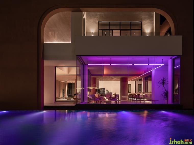 夜幕降臨,白天被昏暗籠罩,夜晚這里變成了民宿的泳池酒吧。