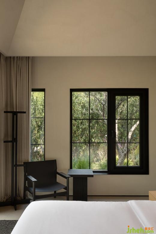 墻面鏤空,床頭與桌面一體化,在此可以飲茶用餐賞戶外美景。床頭柜上,一個(gè)融合了中西方文化元素的香薰陶罐散發(fā)迷人氣息,天圓地方,韻味獨(dú)特。