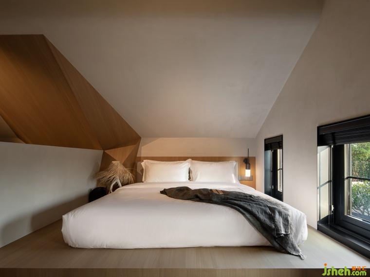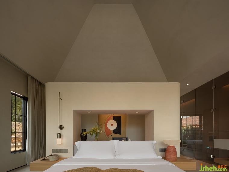 The wall is hollowed out, and the bedside and desktop are integrated, where you can enjoy tea, meals and outdoor scenery. On the bedside table, an aromatherapy pottery jar that combines Chinese and Western cultural elements exudes a charming scent, with a unique charm.
