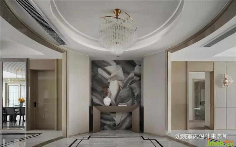 圓形的吊頂和圓形水晶金屬的旋轉(zhuǎn)吊燈的設(shè)計,更加凸顯了門廳在整體空間中的重要性地位,也使整體空間更具層次感。