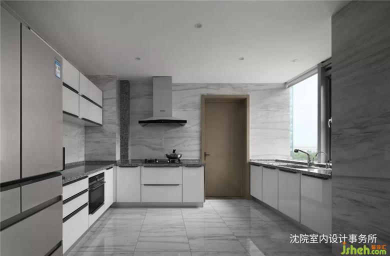 灰色大理石和白色櫥柜的相結(jié)合,使得廚房更具明亮感和空間感,大扇窗又使廚房整體空間更加通透。