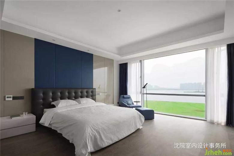 整面落地窗的設(shè)計使整體更加具有空間感,藍色背景墻與藍色沙發(fā)椅搭配空間,與窗外的湖景相互輝映。