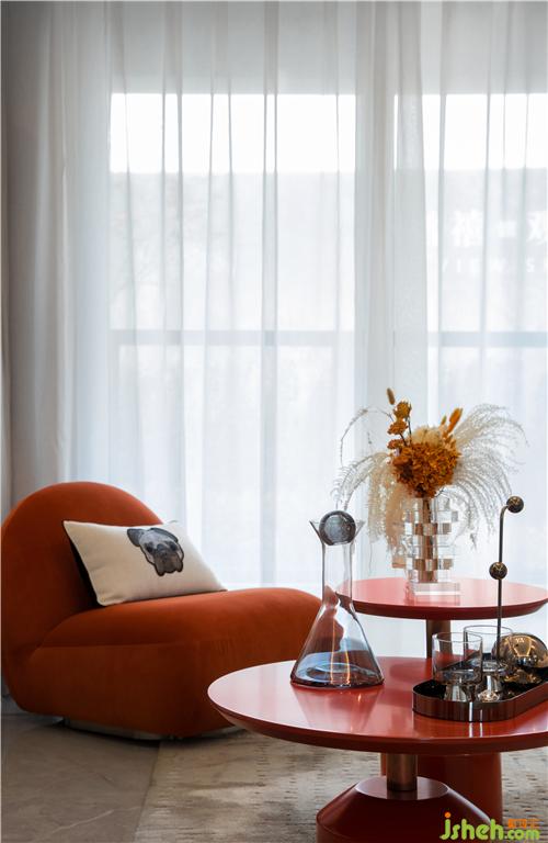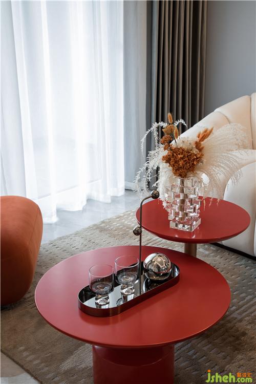 紅色的Q彈沙發(fā)、紅色的圓形小桌