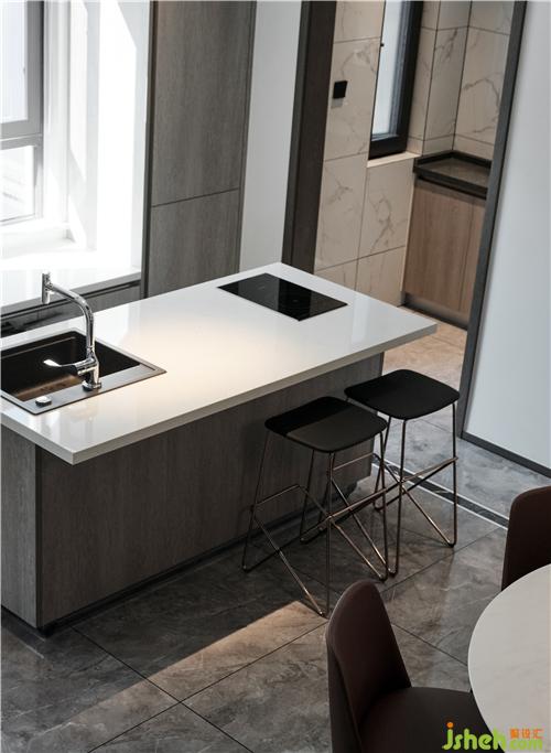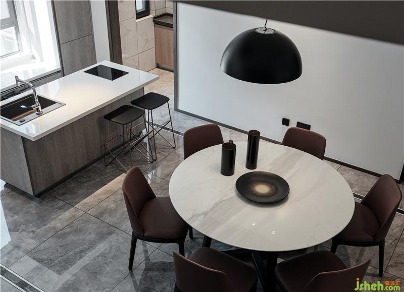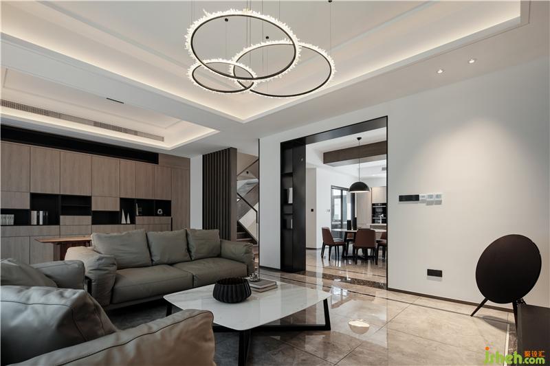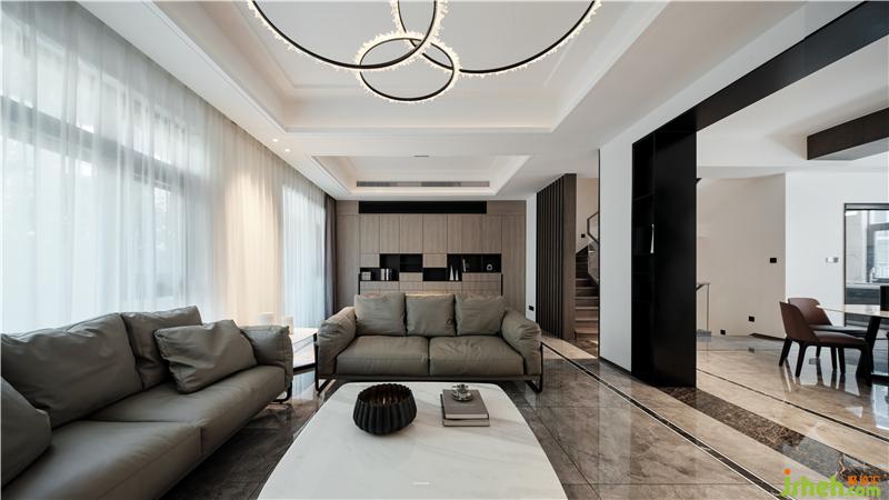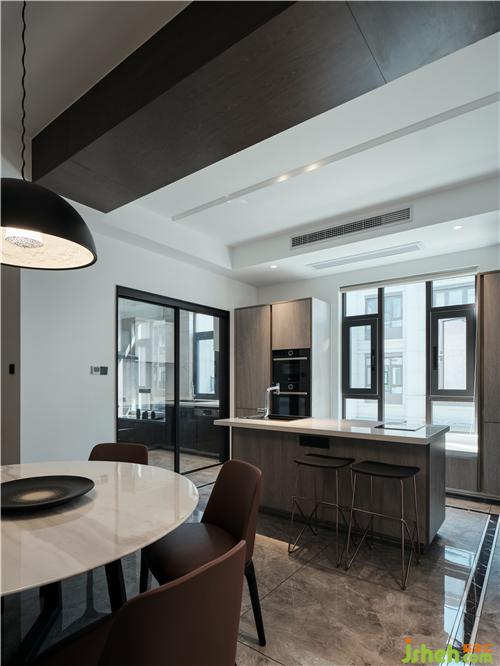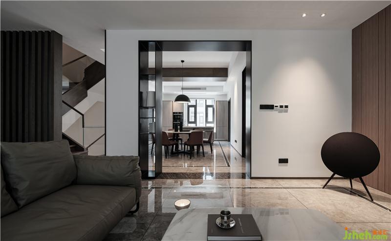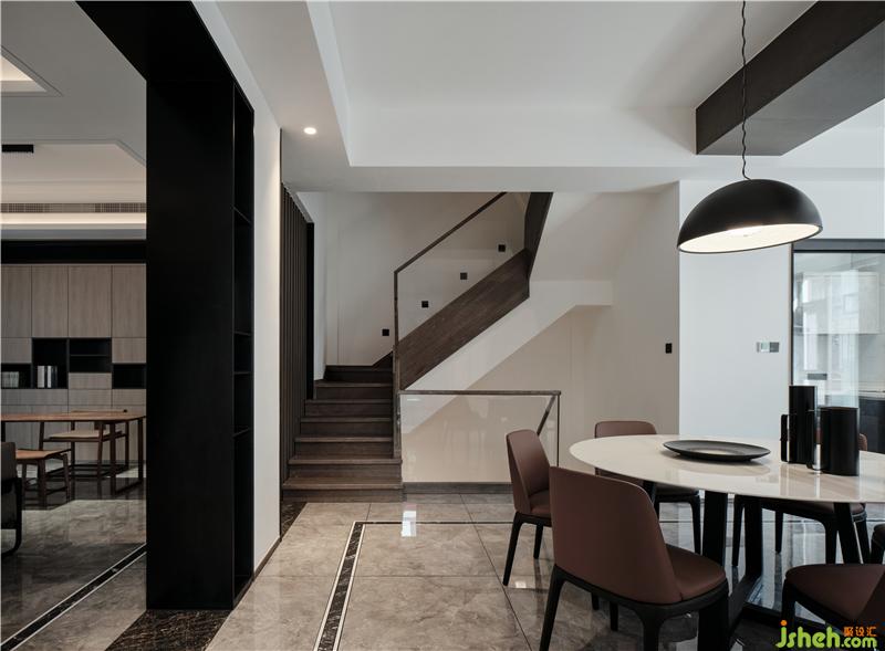 整體色調(diào)以白色為主,佐以黑色和原木色為點(diǎn)綴。大面積粉刷白色乳膠漆,黑色金屬門套和踢腳線強(qiáng)調(diào)現(xiàn)代主題,黑與白的碰撞與交織,加上自然的原木色作為調(diào)和,給人安靜、舒適和沉穩(wěn)的視覺(jué)享受。蘇州別墅裝飾餐廳上方矮梁用深色木飾面做寬作為餐廳與西廚區(qū)的分隔,樓梯側(cè)墻去半,改用木質(zhì)格柵增加客餐廳之間的聯(lián)系和線條感,虛實(shí)結(jié)合、錯(cuò)落有致,進(jìn)而增加了通透性和層次感。