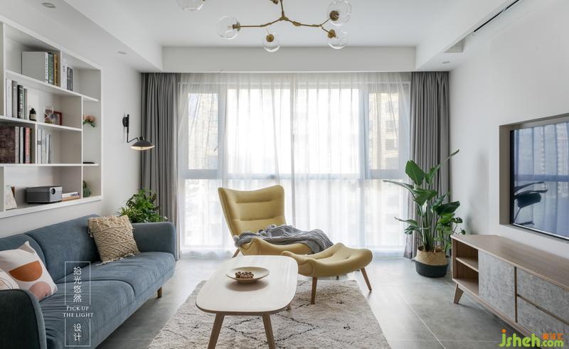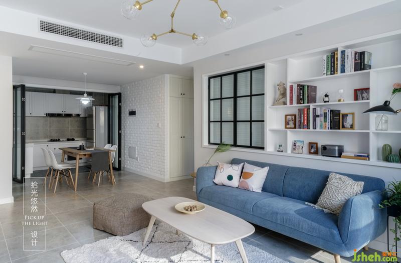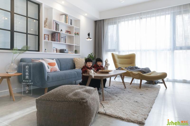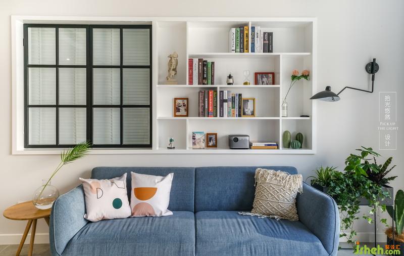 沙發(fā)背景墻的一邊是鋁合金邊框噴黑色氟碳漆窗扇,它還構成了一個有意思的生活伏筆,另一邊是現(xiàn)場做的裝飾架,可以放下有關家人的珍貴瞬間