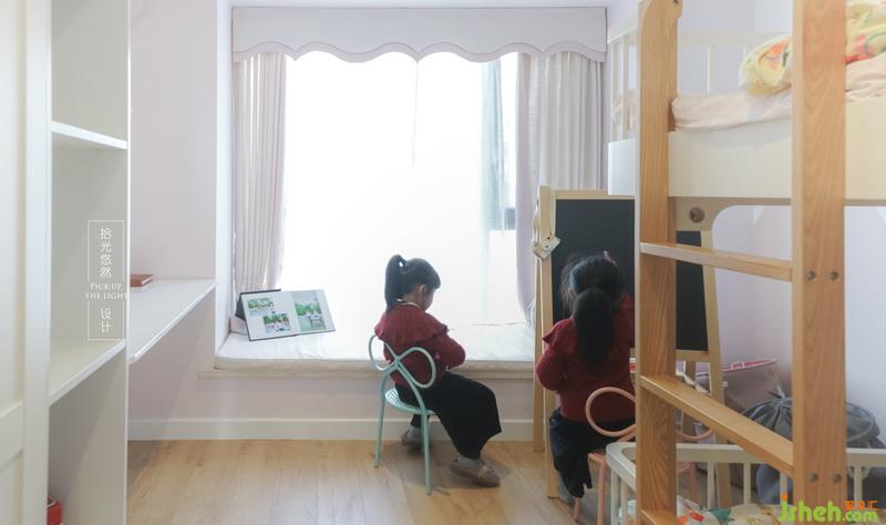左邊為雙胞胎小可愛們做了可以寫作業(yè)的書桌,以及放心愛玩具的陳列柜,飄窗和小黑板容納她們的想象力