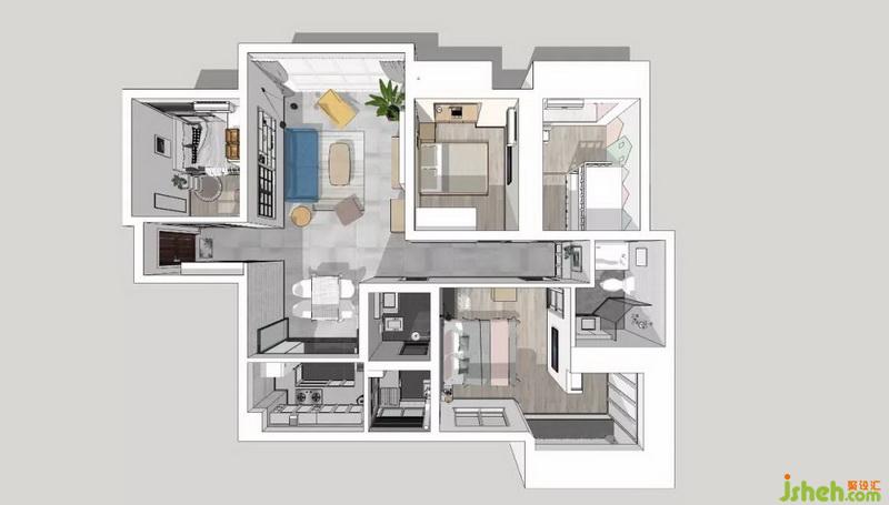 把原有的墻面拆除以后往外擴(kuò),獨(dú)立的淋浴區(qū)、浴缸和雙面盆,超級(jí)全面的功能體驗(yàn)感