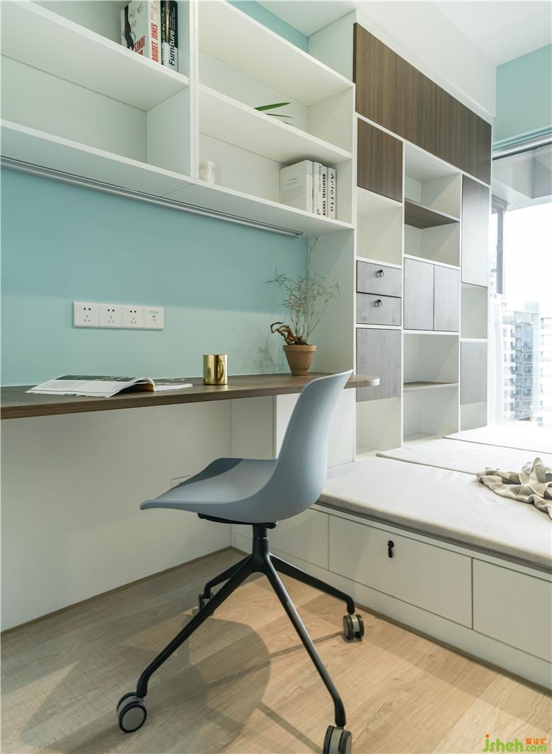 黑胡桃作為點(diǎn)綴,以白色與淡藍(lán)綠色為基調(diào),兼具了榻榻米收納功能可以滿足臨時(shí)性的睡眠需求
