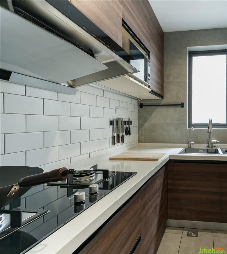黑胡桃木色的櫥柜搭配灰色水泥磚