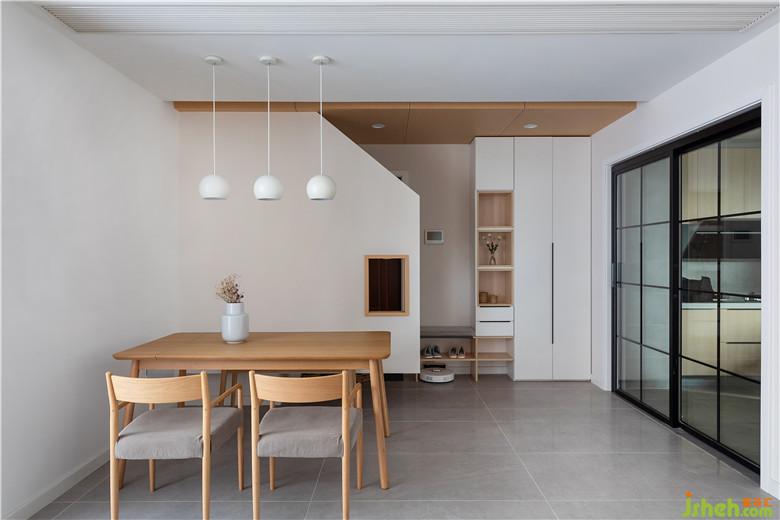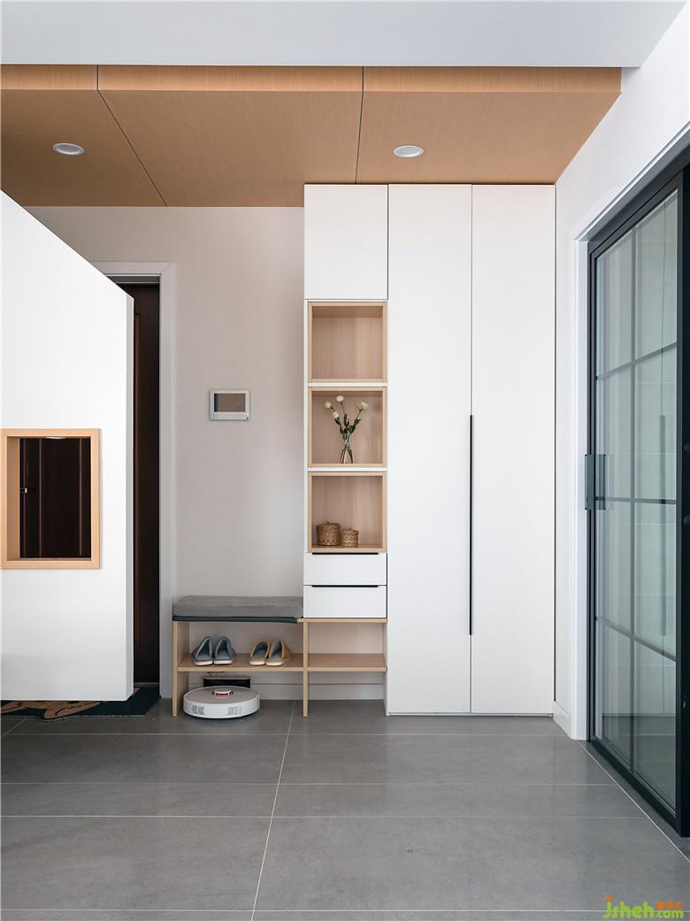 原玄關(guān)空間獨(dú)立又封閉,陰暗不合理,且屋主不希望一進(jìn)門就看到餐廳,直觀全室。設(shè)計(jì)師為他們做了一個(gè)懸空半墻隔斷,去解決原戶型上的缺陷。小姐姐特別提到一個(gè)心愿就是 全屋可用掃地機(jī)器人 ,做到無衛(wèi)生死角。為了滿足屋主的心愿,我們把所有需清掃的柜體及角落都按照掃地機(jī)器人的身高量身定制了懸空柜體。