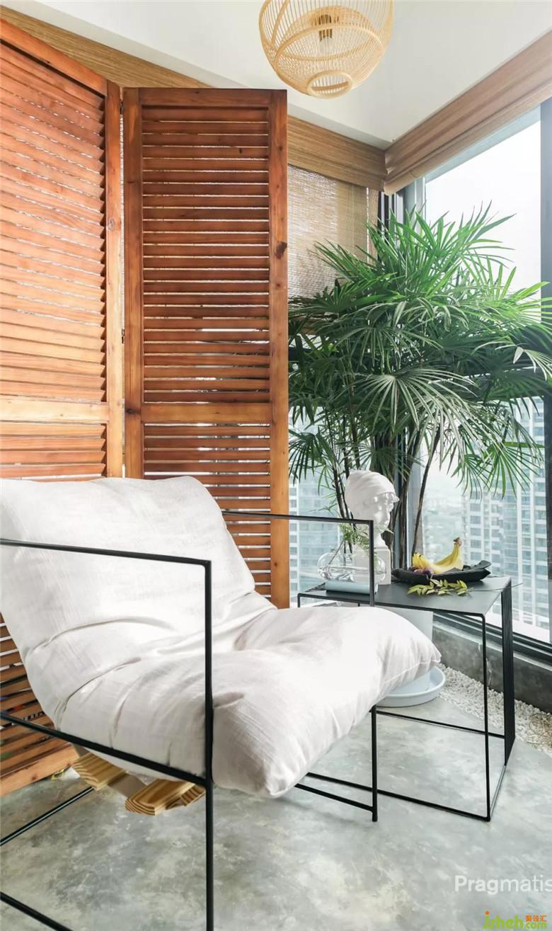 休閑陽臺水泥地面,做了拋光處理,日式竹簾,白色小石子營造休閑的氛圍,屏風(fēng)隔斷遮擋空調(diào)外機。