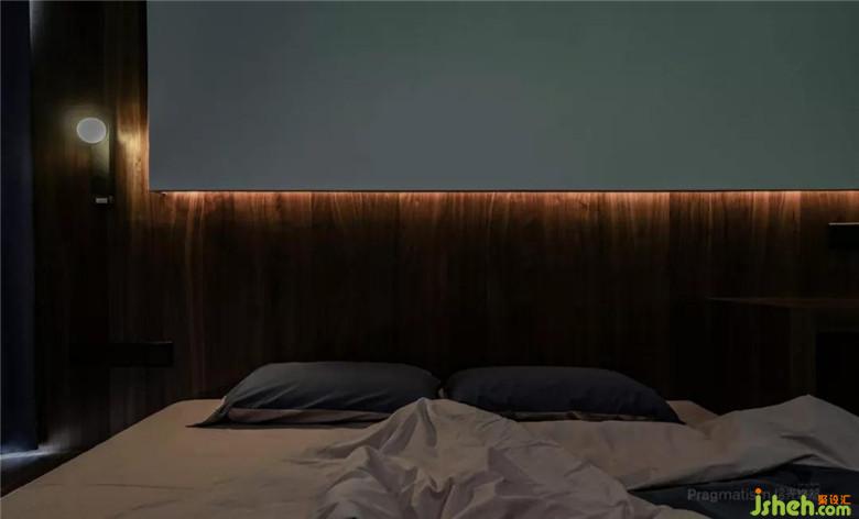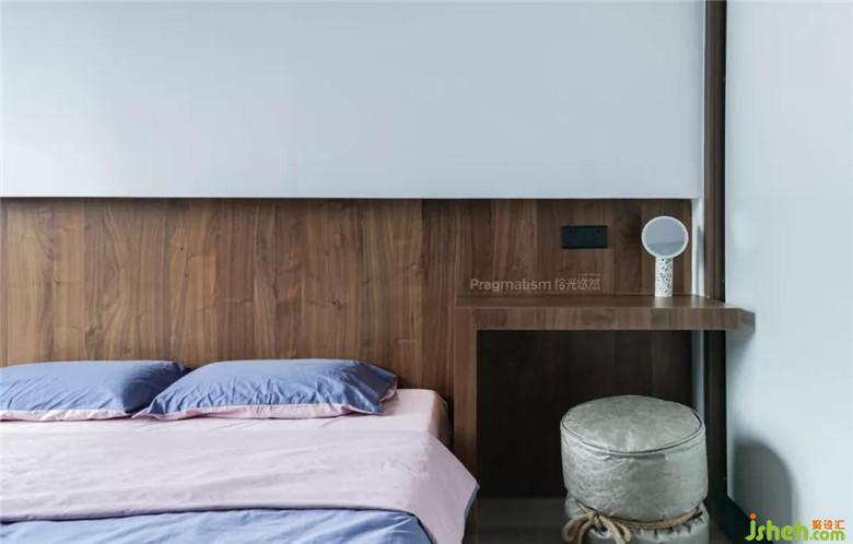 主臥是現(xiàn)場(chǎng)制作的黑胡桃榻榻米式床,現(xiàn)場(chǎng)制作的黑胡桃梳妝臺(tái),通過(guò)柔性光源營(yíng)造舒適的就寢氛圍。