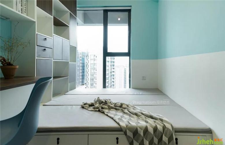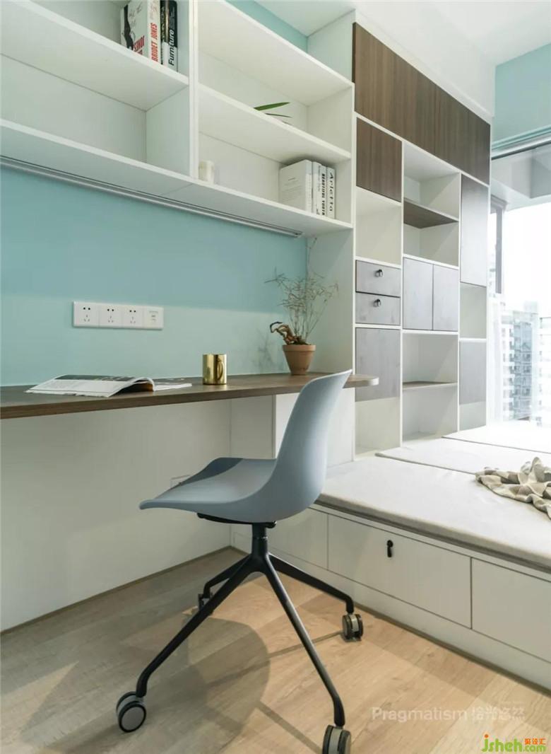 在多功能書(shū)房的設(shè)計(jì)黑胡桃作為點(diǎn)綴,以白色與淡藍(lán)綠色為基調(diào),兼具了榻榻米收納功能可以滿足臨時(shí)性的睡眠需求。