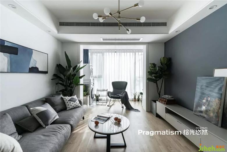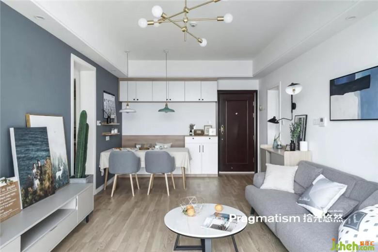 在客廳的整體色彩表達(dá)上,設(shè)計(jì)師主要采用霧霾藍(lán)與白色為主色調(diào),再搭配少許木色、墨綠色作為調(diào)節(jié)視覺(jué)感受的點(diǎn)綴。