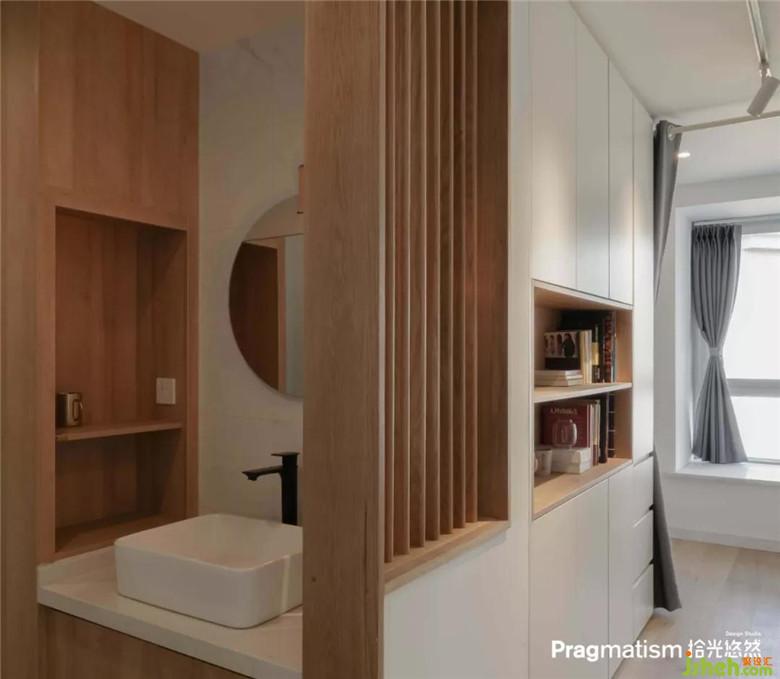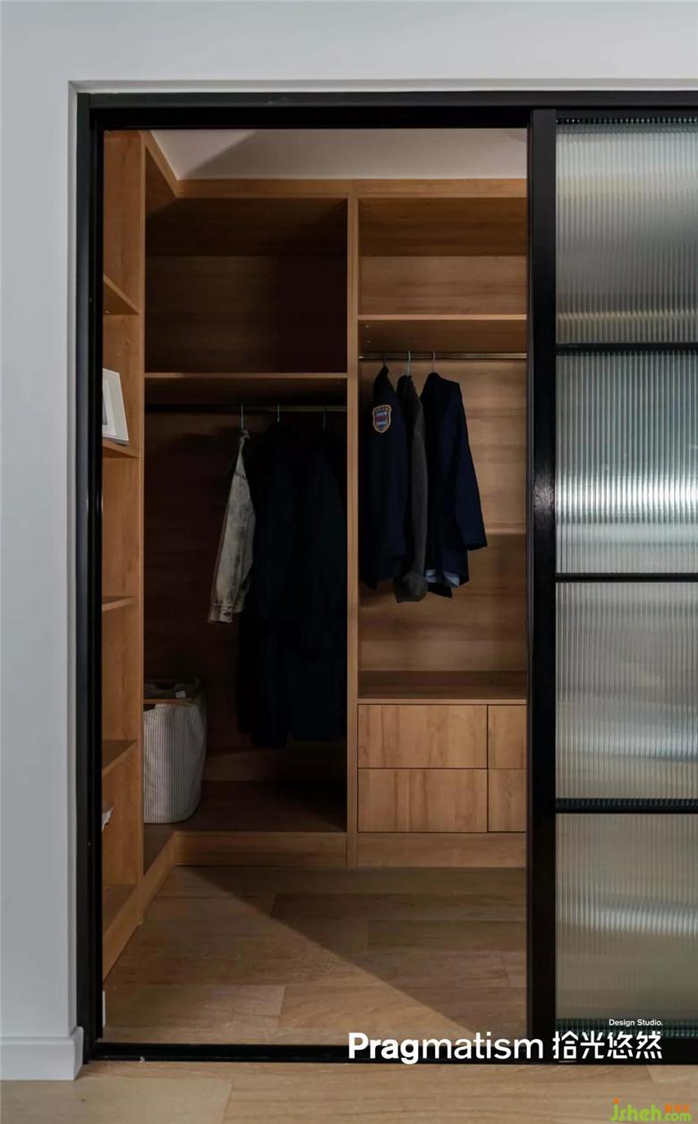 梳妝臺被放在靠近主衛(wèi)的一側(cè),女主化妝卸妝時(shí)距水源更近,更方便。感覺花瓶后有個(gè)插座在偷窺。衣帽間里衣柜沒有做柜門,作為一個(gè)獨(dú)立的封閉空間,推拉門起到了隔絕灰塵的作用。