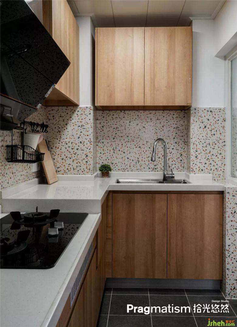 櫥柜做了高低臺面,洗菜切菜不彎腰,炒菜不超高。裝修公司瓷磚貼了半墻,水磨石點(diǎn)綴單調(diào)的墻面。