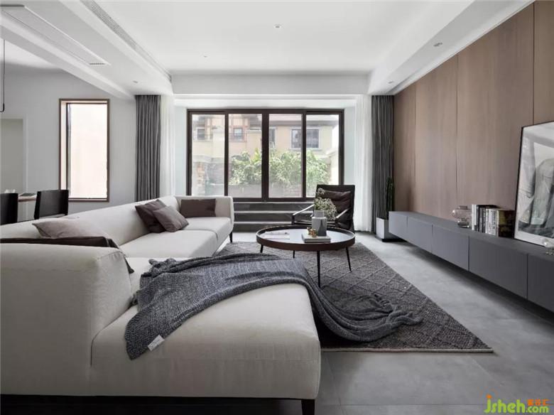 客廳采用的是木飾面與水泥板打造低調(diào)慵懶的氛圍,電視櫃定制懸掛,更現(xiàn)代極簡。