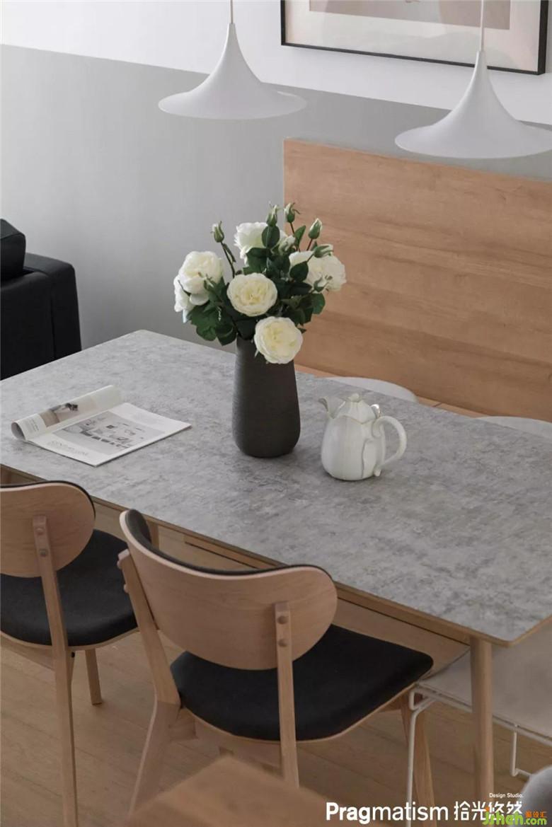 餐桌選擇了NORHOR家的實(shí)木餐桌,桌面強(qiáng)烈的藝術(shù)設(shè)計(jì)感給單一的原木風(fēng)增加更多的視覺沖擊。屋主家有藏酒的愛好,所以設(shè)計(jì)餐邊柜和懸空柜能整潔的收納陳列。而餐廳區(qū)是屋主家使用頻率較高的地方,卡座的設(shè)計(jì)讓用餐不會(huì)因?yàn)樽徊粔蚨@得擁擠。