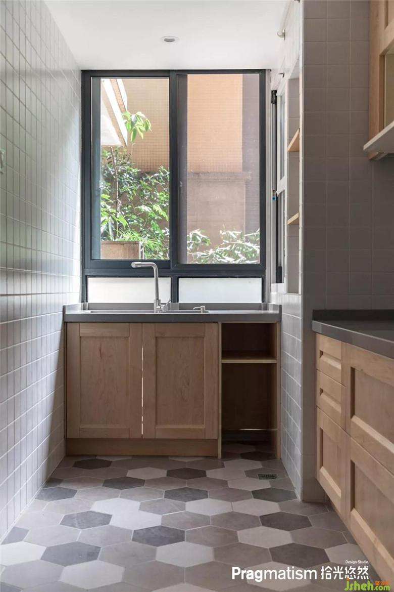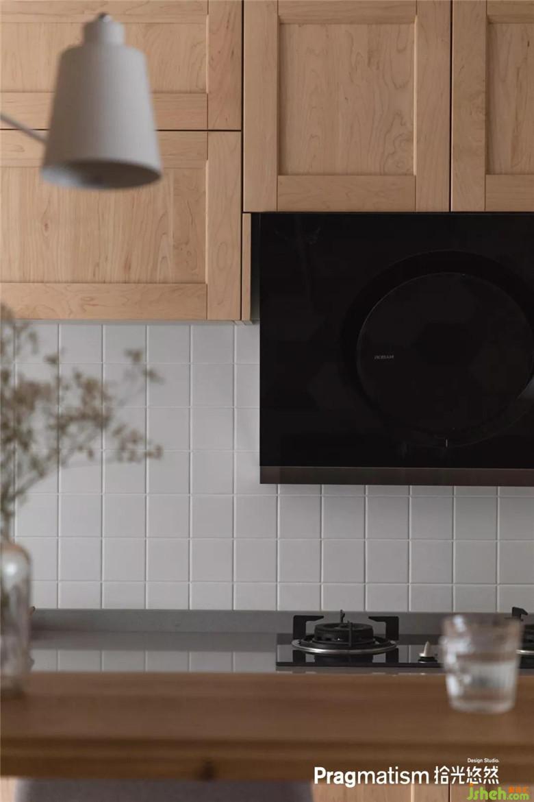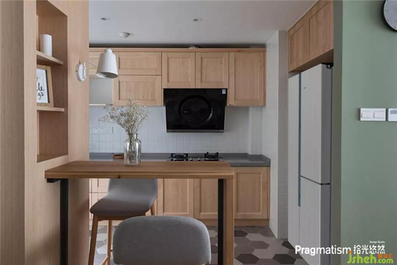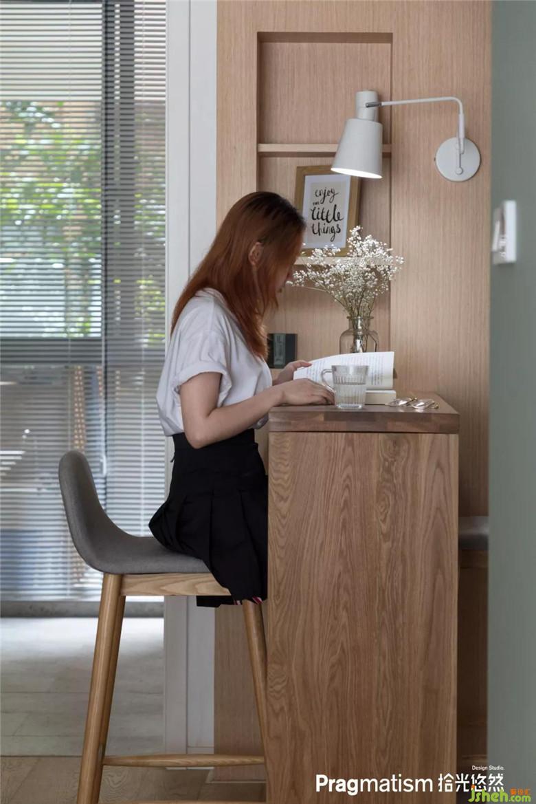 櫥柜柜面與踢腳板都用實(shí)木制作更加整潔統(tǒng)一,在吧臺(tái)工作,聊天,看書,品酒,喝茶,何不美哉。