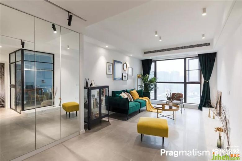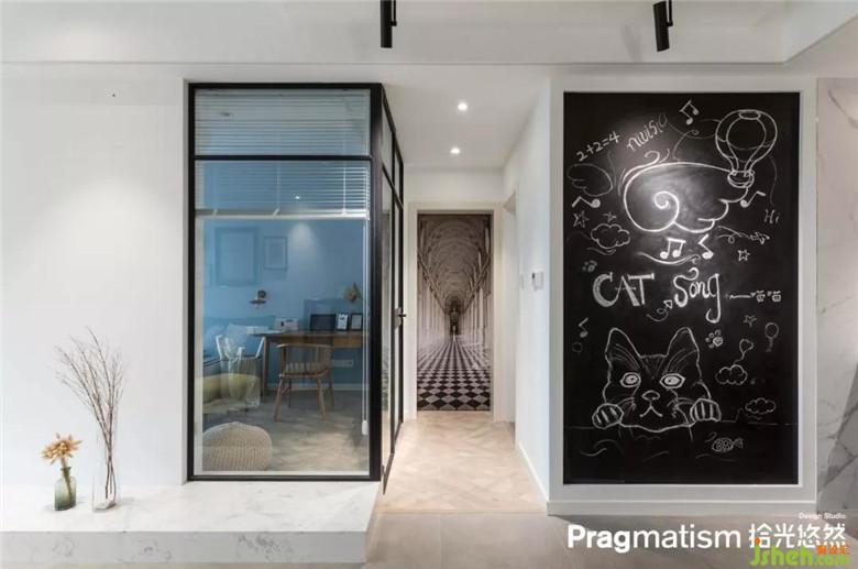 在設(shè)計(jì)多功能房時(shí),將轉(zhuǎn)角的墻面全部設(shè)計(jì)成玻璃墻體。一方面來的客人有對貓毛過敏的話就可以做一間隔離室;二是當(dāng)貓咪們獨(dú)自在客廳玩耍時(shí)不會因?yàn)檎也坏街魅硕械焦陋?dú)焦慮。