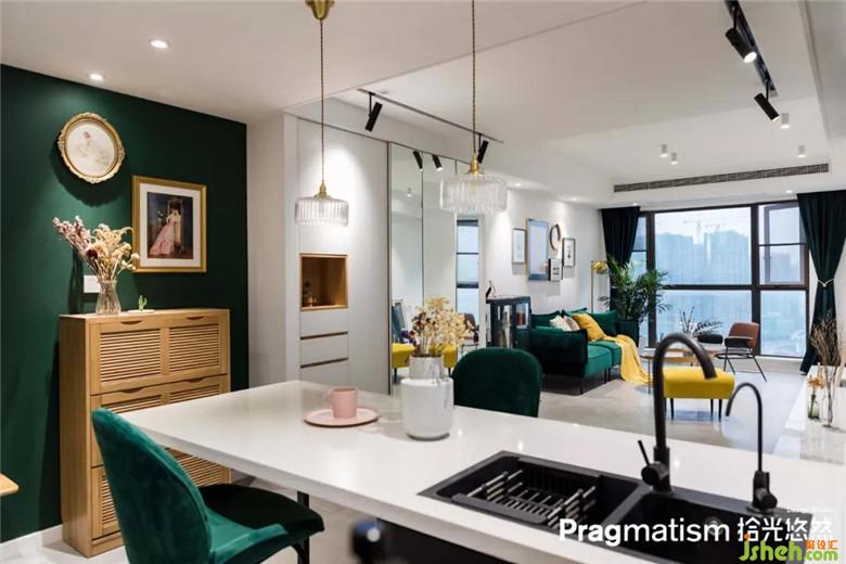 這抹綠繼續(xù)延續(xù)到餐廚區(qū),溫暖柔軟的天鵝絨餐邊椅,緩解墻體的硬朗感,用濃妝淡抹總相宜來形容在合適不過了。