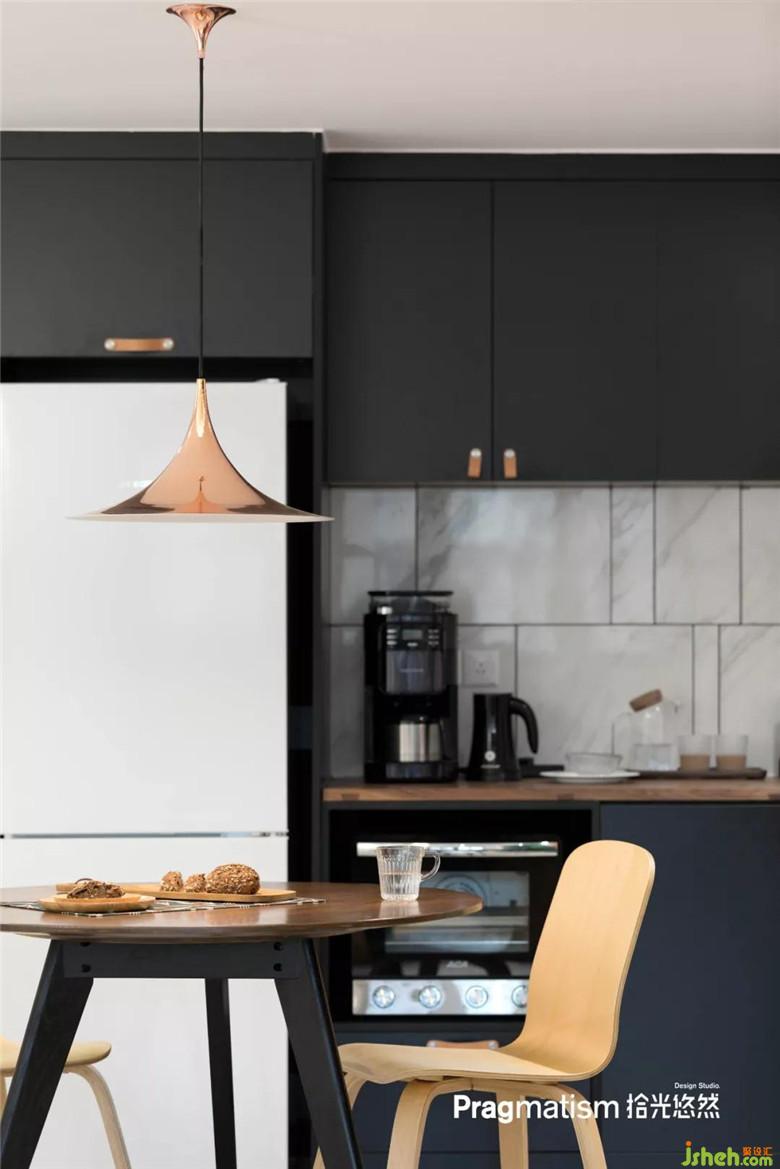 通過地面材質(zhì)的區(qū)分,把通道的面積也劃給了餐廳,餐廳顯得大了許多。