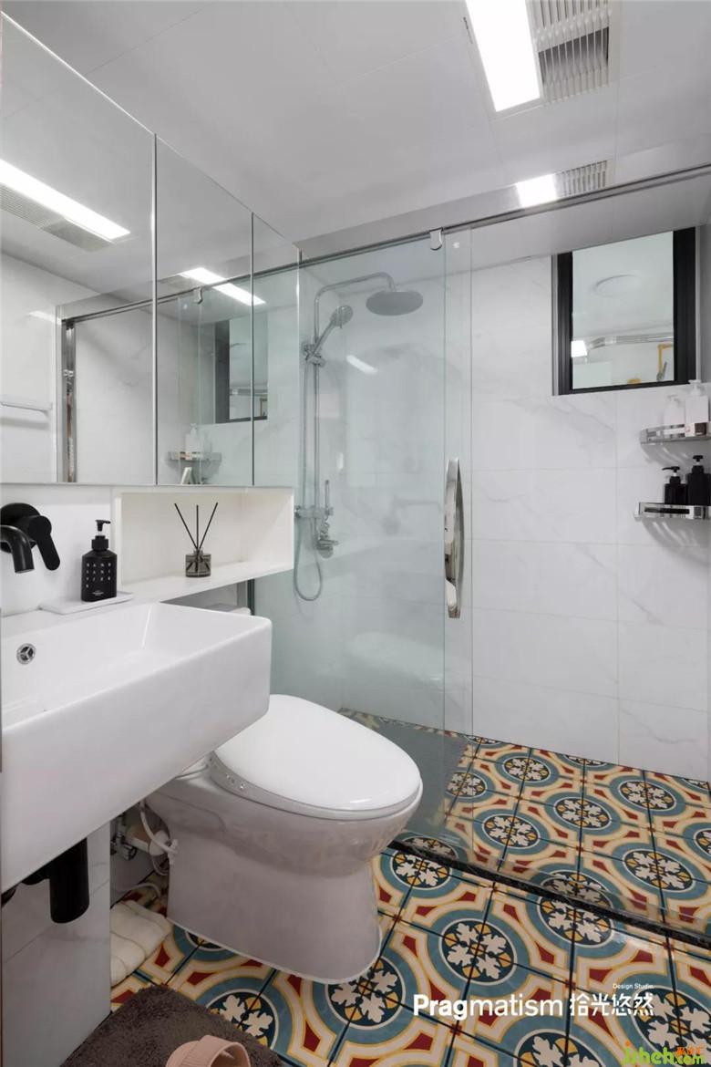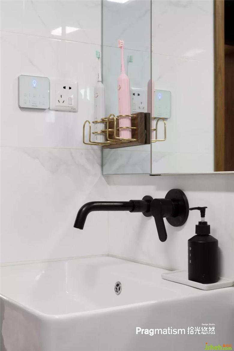 壁掛式洗臉盆、龍頭和墻排式下水,解決衛(wèi)生死角。鏡柜遮蔽了下水管,同時做了加長設(shè)計(jì),室內(nèi)設(shè)計(jì)師通過大面積的鏡面,和白色調(diào)的瓷磚,視覺和心理上拓展了衛(wèi)生間的空間。電動牙刷架旁邊的插座是留給電吹風(fēng)的,在鏡柜內(nèi)部專門為牙刷充電預(yù)留了一個四孔插座。