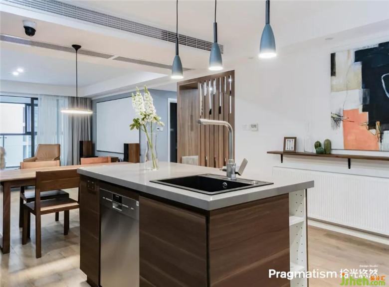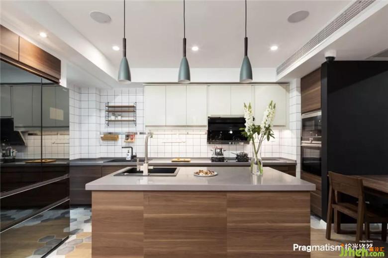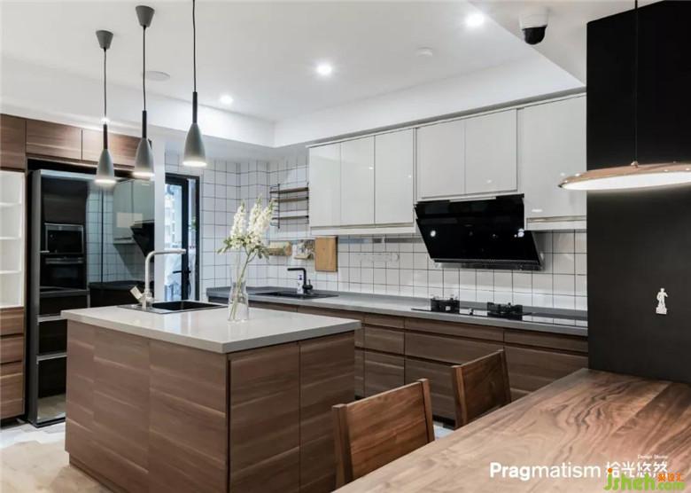 將原有的廚房砸掉以后與原有的餐廳結(jié)合,做成櫥柜+高柜+島臺(tái)+餐廳的方式,采用回字形動(dòng)線??梢宰屌腼冏兂梢患腥さ氖虑椤O硎芘c家人一起分享美食的樂趣。