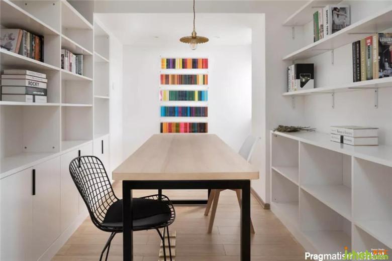 書房的柜子顏色統(tǒng)一、形式獨立,裝飾掛件是從荷花池買了鉛筆,挨個排好以后掛上去的。